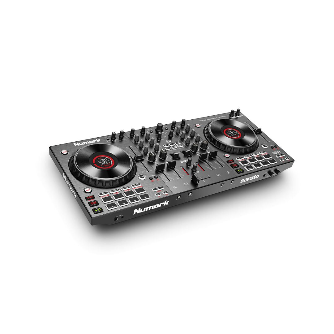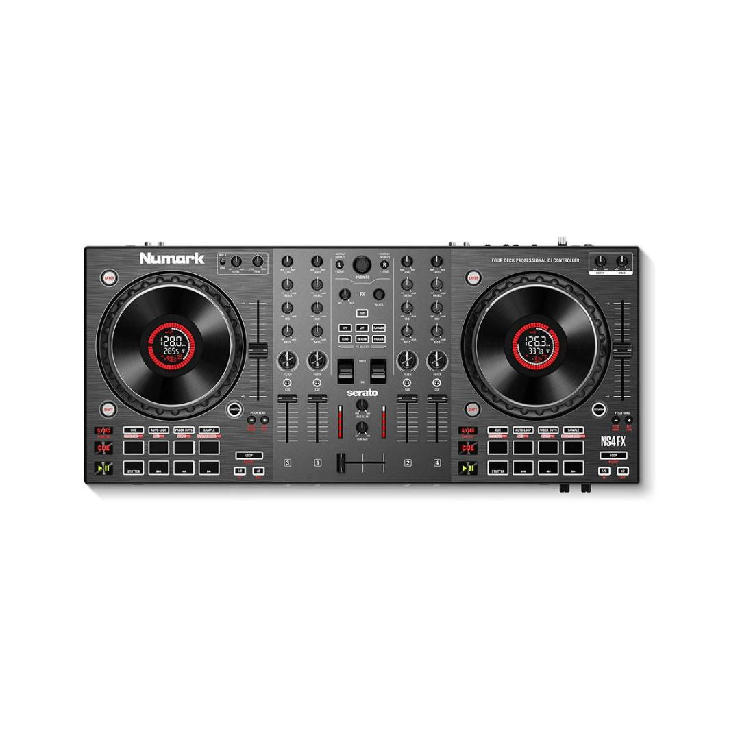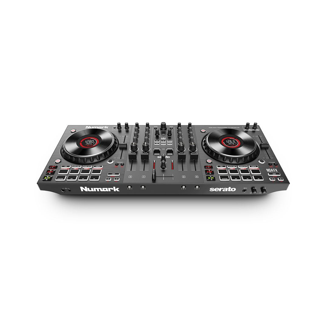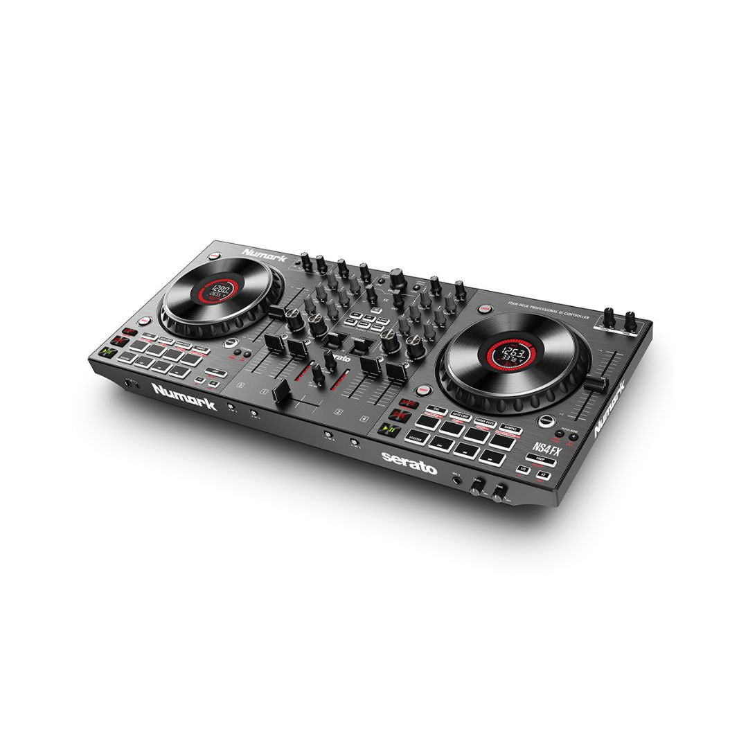 : DJ Controllers, DJ GearTags: 4-Deck DJ Controller, Black, Built-in FX, color-coded pads, DJ controller, dual-layer playback, High-performance platters, Large jog wheels controller, Multiple Connectivity Options, NS4FX, Numark, Numark NS4FX, Serato DJ Pro compatible DJ controller