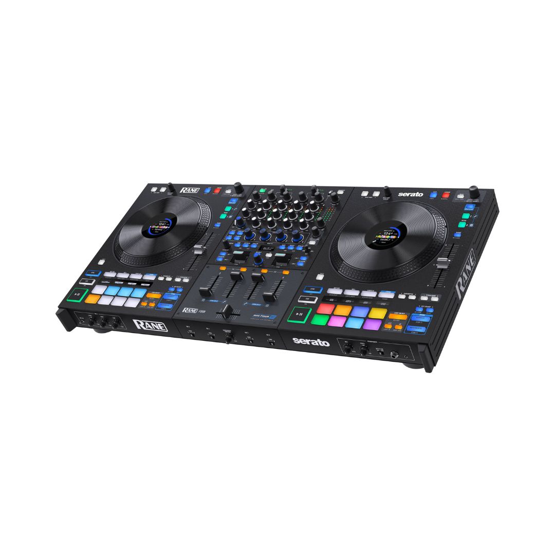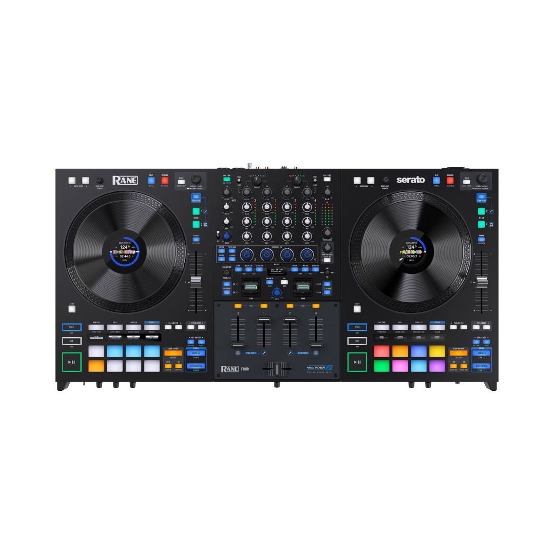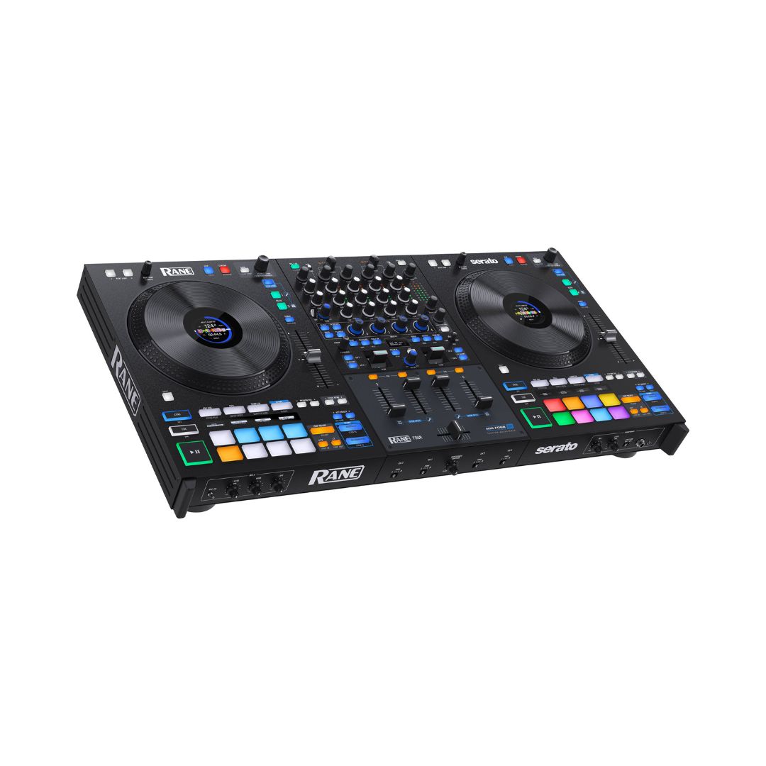DJ Controllers, DJ GearTags: 4-channel DJ controller, Black, Built-in microphone inputs, Creative FX with internal effects suite, DJ controller, High-performance DJ controller, Independent Acapella buttons, Independent Instrumental buttons, Large jog wheels with display, Rane DJ, RANE DJ FOUR, Serato DJ Pro compatible controller, Stems DJ controller