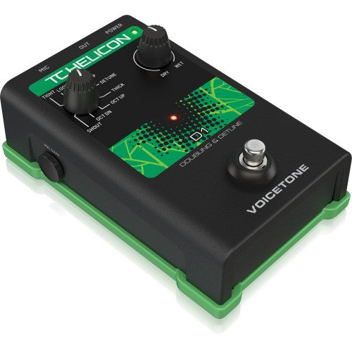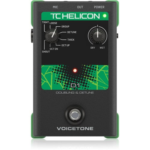 This is the VoiceTone D1, a creative doubling/detune effect pedal that's been fine-tuned for vocalists. Use it to generate octaves (up or down), thicken up your vocal sound, get an interesting "de-tuned" effect, create a "shout-style" sound, and much more. Best of all, the VoiceTone D1 gives you the flexibility to reshape your sound whenever you want, making you even more of the "take charge" vocalist you already are. For even more fun onstage, be sure to chain the VoiceTone D1 with other VoiceTone pedals from TC-Helicon.